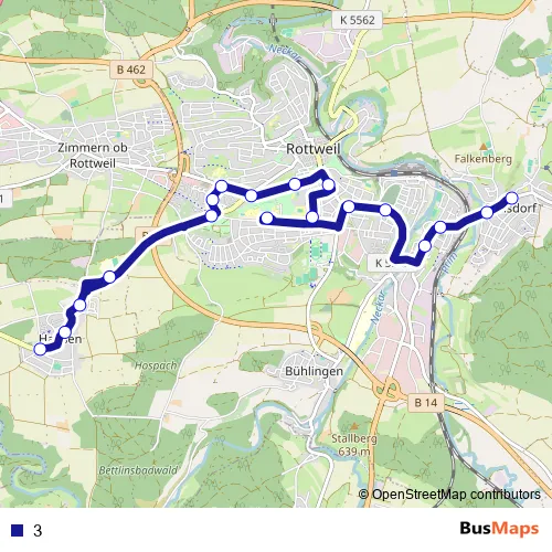The first stop of the 3 bus route is Rottweil Hausen o.R. Horgenerstraße and the last stop is Rottweil Göllsdorf Kreissparkasse. 3 is operational during everyday.