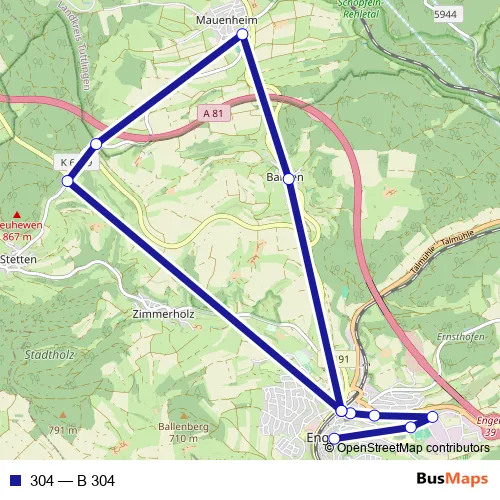 The first stop of the 304 bus route is Engen (Hg), Maxenbuck and the last stop is Engen (Hg), Bahnhof. 304 (B 304) is operational during on weekdays.