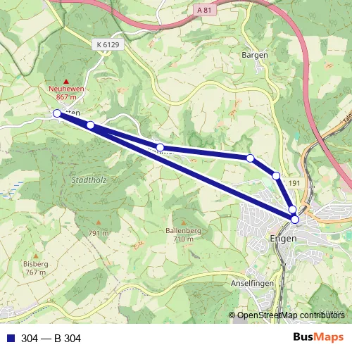 The first stop of the 304 bus route is Engen (Hg), Bahnhof and the last stop is Engen (Hg), Bahnhof. 304 (B 304) is operational during on weekdays.