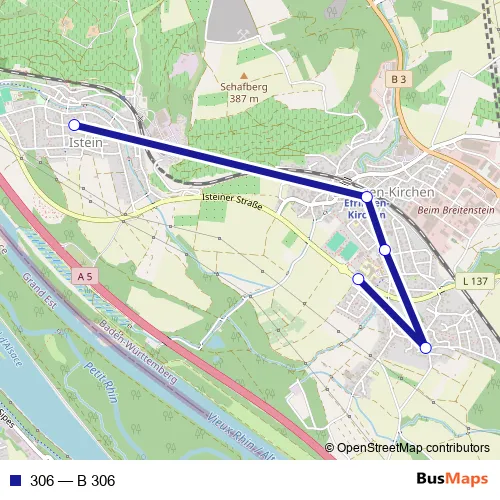 The first stop of the 306 bus route is Efringen-Kirchen, Schule and the last stop is Istein, Schule. 306 (B 306) is operational during on weekdays.