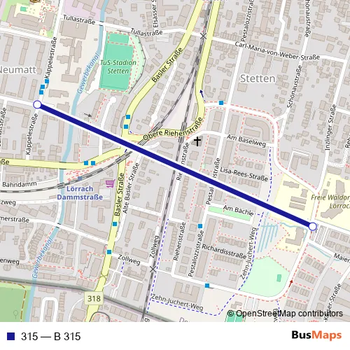 The first stop of the 315 bus route is Stetten (LÖ), Neumatt and the last stop is Lörrach, Freie Waldorfschule. 315 (B 315) is operational during on weekdays.