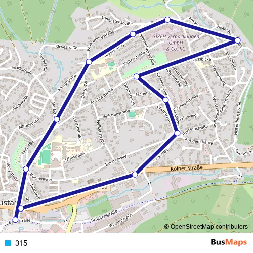 The first stop of the 315 tram route is Bergneustadt Graf-Eberhard-Platz / Zentrum and the last stop is Bergneustadt Graf-Eberhard-Platz / Zentrum. 315 is operational during everyday.