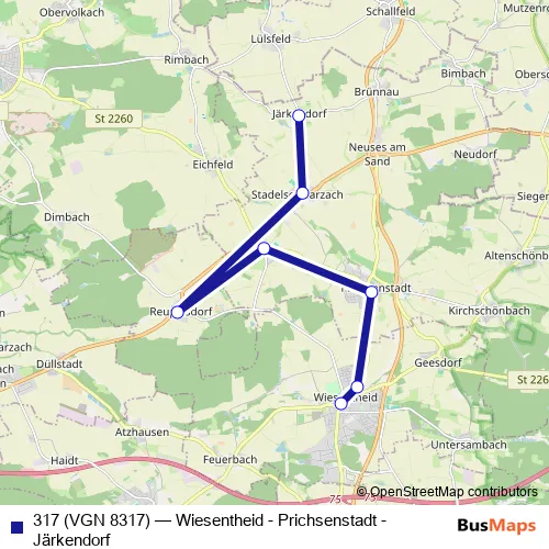 The first stop of the 317 (VGN 8317) bus route is Järkendorf Ortsmitte and the last stop is Wiesentheid Marienplatz. 317 (VGN 8317) (Wiesentheid - Prichsenstadt - Järkendorf) is operational during on weekdays.