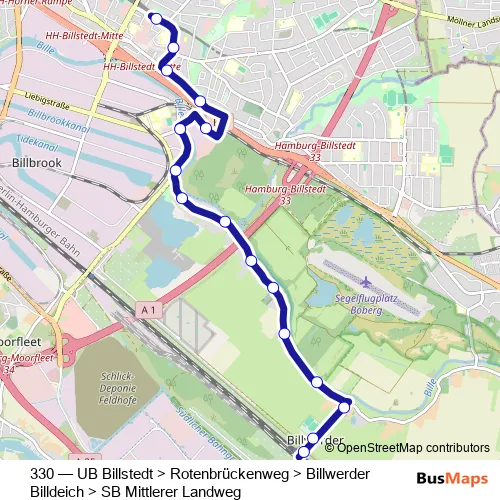 The first stop of the 330 bus route is S Mittlerer Landweg and the last stop is U Billstedt. 330 (UB Billstedt > Rotenbrückenweg > Billwerder Billdeich > SB Mittlerer Landweg) is operational during everyday.