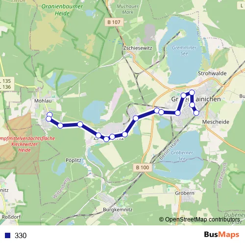 The first stop of the 330 bus route is Möhlau, Siedlung and the last stop is