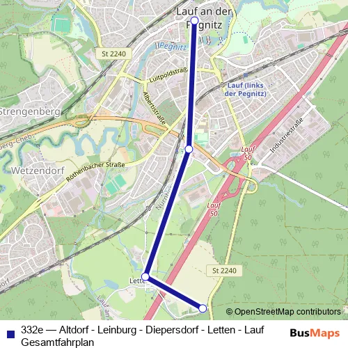 Bus 332e - Altdorf - Leinburg - Diepersdorf - Letten - Lauf Gesamtfahrplan in Lauf an der Pegnitz: Stops & Timetable