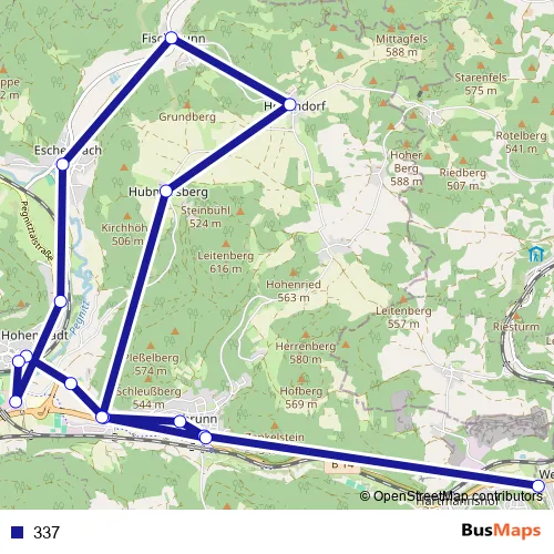The first stop of the 337 bus route is Hartmannshof Schule and the last stop is Hubmersberg. 337 is operational during everyday.