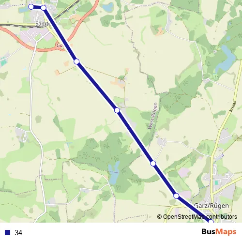 The first stop of the 34 bus route is Garz Wendeschleife and the last stop is Samtens Schule. 34 is operational during on weekdays.