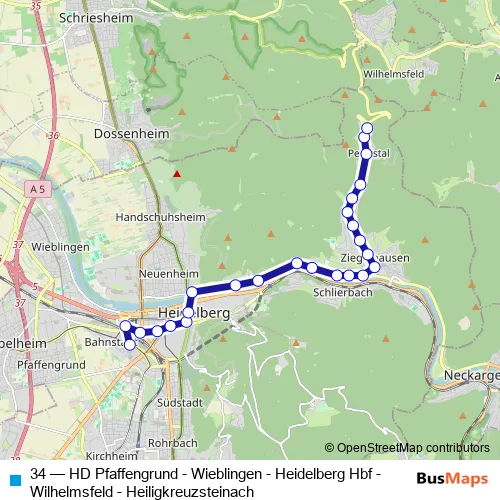 The first stop of the 34 bus route is HD Hauptbahnhof Süd and the last stop is Heidebuckelweg. 34 (HD Pfaffengrund - Wieblingen - Heidelberg Hbf - Wilhelmsfeld - Heiligkreuzsteinach) is operational during everyday.