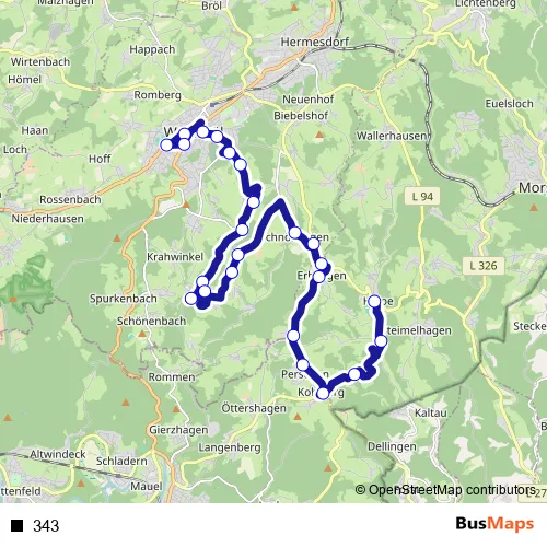 The first stop of the 343 bus route is Waldbröl Busbf and the last stop is Morsbach Holpe. 343 is operational during on weekdays.