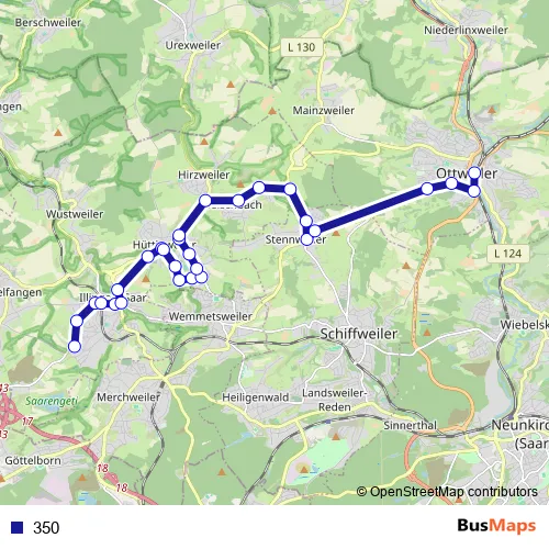 The first stop of the 350 bus route is Gymnasium, Illingen and the last stop is Bahnhof, Ottweiler. 350 is operational during everyday.