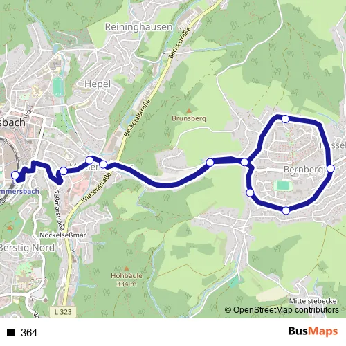 The first stop of the 364 bus route is Gummersbach Bf and the last stop is Gummersbach Bf. 364 is operational during everyday.