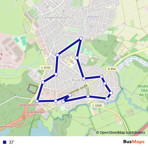 The first stop of the 37 bus route is Erlensee-Langendiebach Rathausplatz and the last stop is