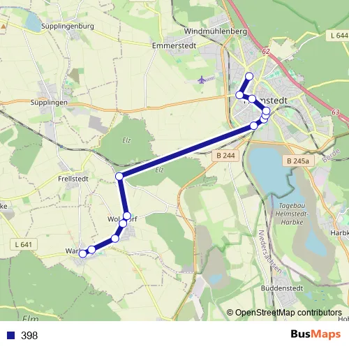 The first stop of the 398 bus route is Warberg Hauptstraße and the last stop is Helmstedt Braunschweiger Tor. 398 is operational during everyday.