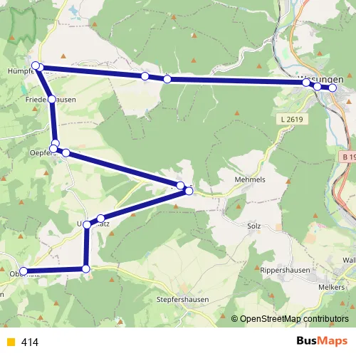 The first stop of the 414 bus route is Wasungen, Schulbrücke and the last stop is Oberkatz. 414 is operational during on weekdays.