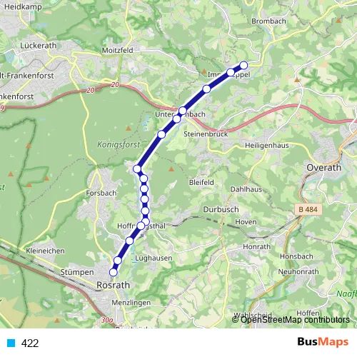 The first stop of the 422 tram route is Overath Immekeppel Haus Thal and the last stop is Rösrath Bf. 422 is operational during everyday.