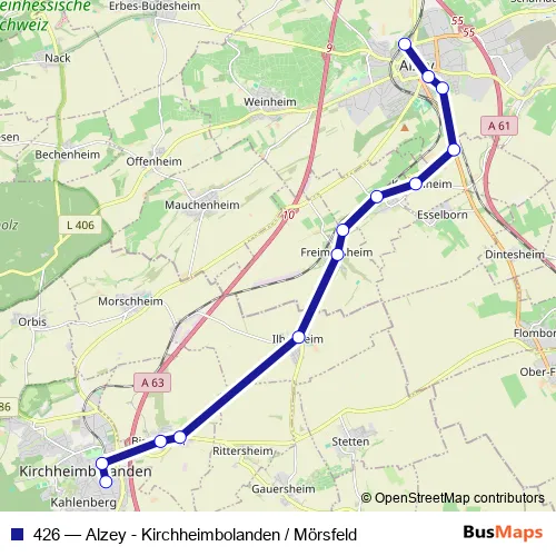 The first stop of the 426 bus route is Alzey, Bahnhof Bstg C and the last stop is Kirchheimbolanden, Bahnhof. 426 (Alzey - Kirchheimbolanden / Mörsfeld) is operational during on weekdays.
