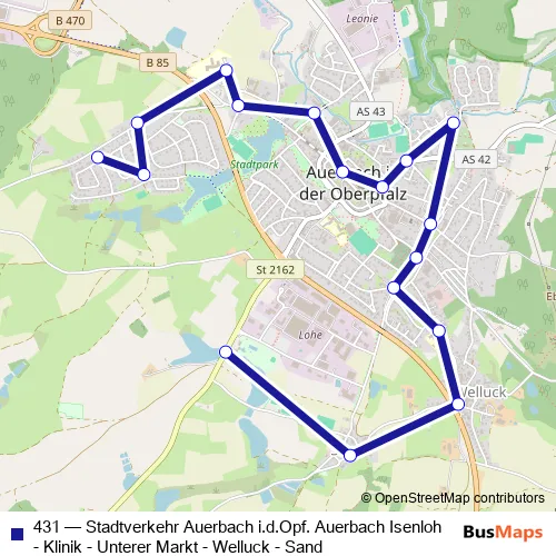 The first stop of the 431 bus route is Auerbach (OPf) Stadtbad and the last stop is Auerbach/OPf Isenloh. 431 (Stadtverkehr Auerbach i.d.Opf. Auerbach Isenloh - Klinik - Unterer Markt - Welluck - Sand) is operational during everyday.