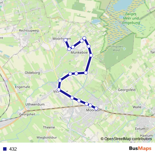 The first stop of the 432 bus route is Südbrookmerland-Moorhusen Igs and the last stop is Moordorf(Südbrookmerland) B72/Ringstraße. 432 is operational during on weekdays.