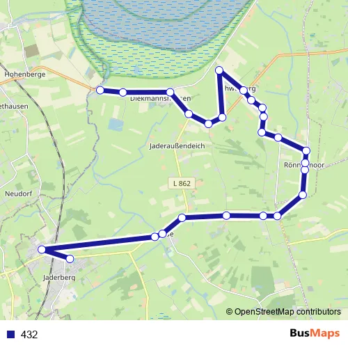 The first stop of the 432 bus route is Jaderberg Schulzentrum and the last stop is Wapelersiel Steffens. 432 is operational during on weekdays.