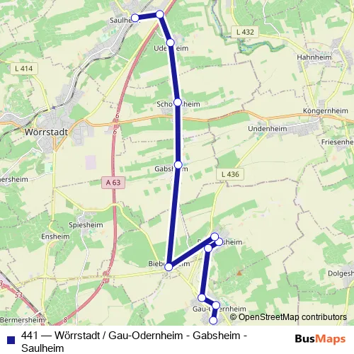The first stop of the 441 bus route is Gau-Odernheim, Alzeyer Straße and the last stop is Saulheim, Bahnhof. 441 (Wörrstadt / Gau-Odernheim - Gabsheim - Saulheim) is operational during everyday.