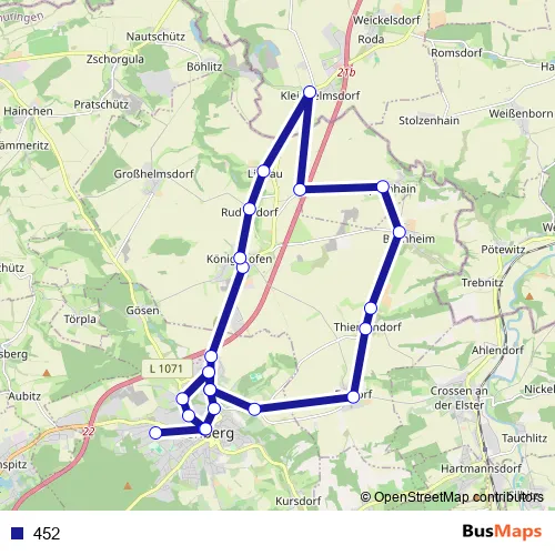 The first stop of the 452 bus route is Eisenberg, Krauseschule and the last stop is Eisenberg, Busbahnhof. 452 is operational during on weekdays.