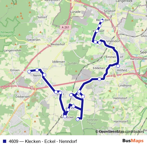 The first stop of the 4609 bus route is Nenndorf, Oberschule and the last stop is Beckedorf, Weiderweg. 4609 (Klecken - Eckel - Nenndorf) is operational during on weekdays.