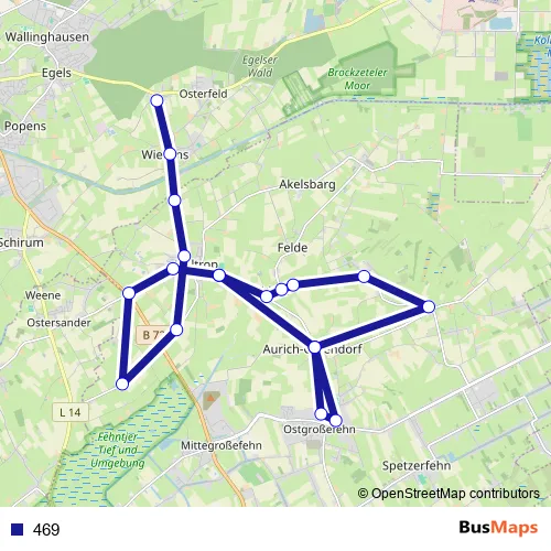 The first stop of the 469 bus route is Holtrop Grundschule Holtrop and the last stop is Wiesens L34/Wiesenser Straße. 469 is operational during on weekdays.