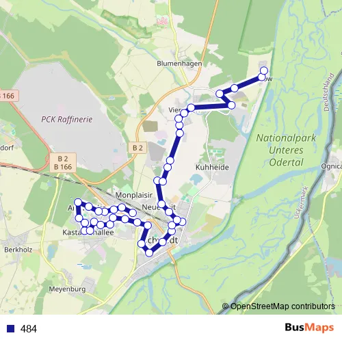 The first stop of the 484 bus route is Schwedt, Zob and the last stop is Gatow, Nord. 484 is operational during everyday.