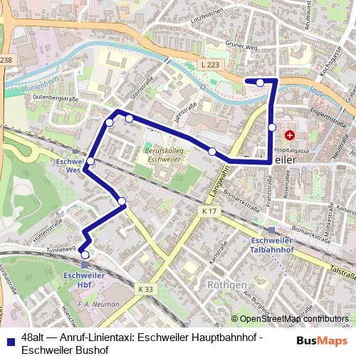 Click here to view the nearest 48alt - Anruf-Linientaxi: Eschweiler Hauptbahnhof - Eschweiler Bushof bus stop.