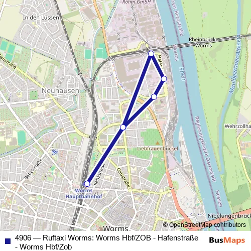 Click here to view the nearest 4906 - Ruftaxi Worms: Worms Hbf/ZOB - Hafenstraße - Worms Hbf/Zob bus stop.