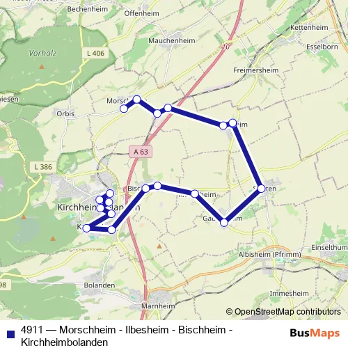 The first stop of the 4911 bus route is Kirchheimbol., Schlossg. Bf. and the last stop is Morschheim, Abzw. Orbis. 4911 (Morschheim - Ilbesheim - Bischheim - Kirchheimbolanden) is operational during everyday.