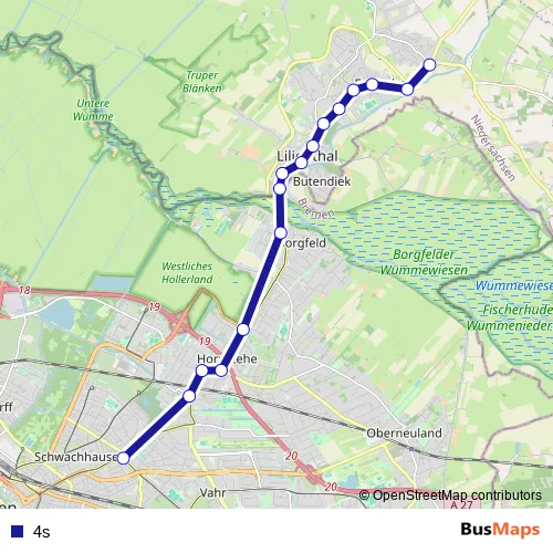 The first stop of the 4s tram route is Bremen Kirchbachstraße and the last stop is Lilienthal. 4s is operational during on weekdays.