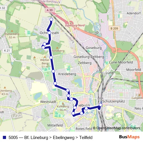 The first stop of the 5005 bus route is Lüneburg, Teilfeld and the last stop is Bf. Lüneburg (Zob). 5005 (Bf. Lüneburg > Ebelingweg > Teilfeld) is operational during everyday.