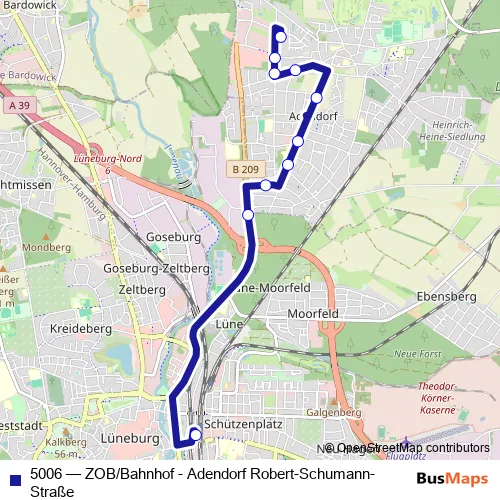 The first stop of the 5006 bus route is Bf. Lüneburg (Zob) and the last stop is Adendorf, Robert-Schumann-Straße. 5006 (ZOB/Bahnhof - Adendorf Robert-Schumann-Straße) is operational during on weekdays.