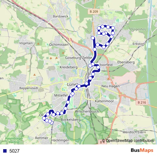 The first stop of the 5027 bus route is Lüneburg, Rosenkamp Wendeplatz and the last stop is Adendorf, Röntgenstraße. 5027 is operational during everyday.