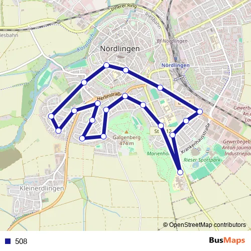 The first stop of the 508 bus route is Nördlingen, Brettermarkt and the last stop is Nördlingen, Brettermarkt. 508 is operational during everyday.