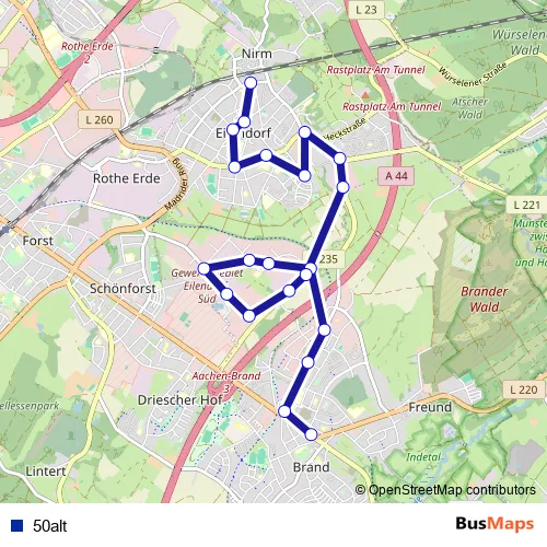 The first stop of the 50alt metro route is Aachen, Brand and the last stop is Aachen, Eilendorf Hansmannstraße (Eilendf Bahnhof). 50alt is operational during on weekdays.