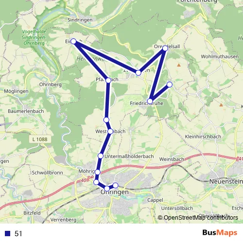 The first stop of the 51 bus route is Öhringen Hbf and the last stop is Zweiflingen Schule. 51 is operational during everyday.