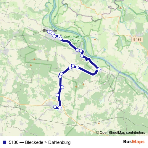 The first stop of the 5130 bus route is Bleckede, Bahnhof and the last stop is Dahlenburg, Markt. 5130 (Bleckede > Dahlenburg) is operational during on weekdays.