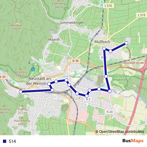 The first stop of the 514 bus route is Mußbach, Weincampus and the last stop is Neustadt, Leibniz-Gymnasium. 514 is operational during everyday.