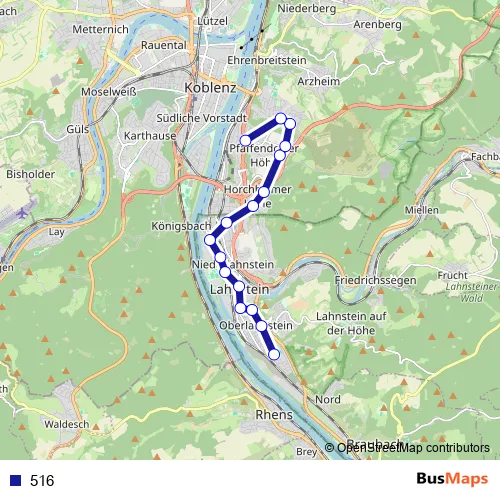 See why over 2 million users trust and consider busmaps.com as the best public transport website. busmaps gives you Koblenz Buses suggested routes, real-time bus tracker, line route maps in Koblenz, and helps to find the closest 516 bus stops near you. No internet available? Download an offline PDF map and bus schedule for the 516 bus to take on your trip.