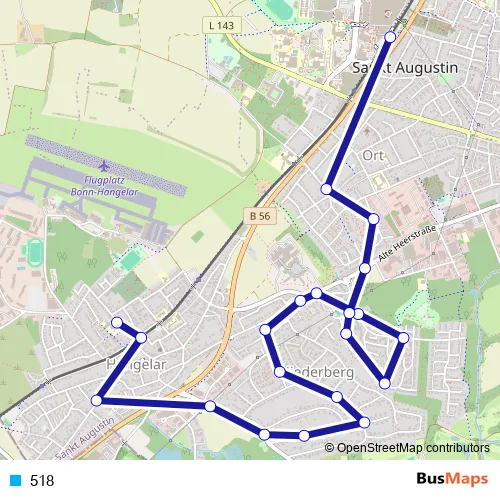 The first stop of the 518 tram route is Sankt Augustin Hangelar Grundschule and the last stop is Sankt Augustin Zentrum. 518 is operational during on weekdays.