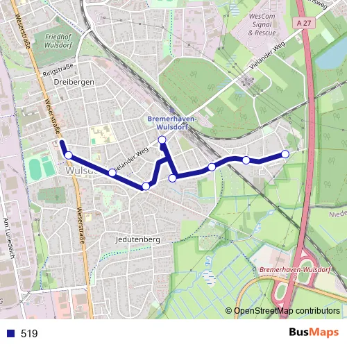 The first stop of the 519 bus route is Bremerhaven Am Rübenberge and the last stop is Bremerhaven-Wulsdorf Mitte. 519 is operational during on weekdays.