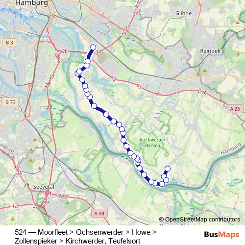 The first stop of the 524 bus route is Teufelsort (Kehre) and the last stop is Moorfleet. 524 (Moorfleet > Ochsenwerder > Howe > Zollenspieker > Kirchwerder, Teufelsort) is operational during on weekdays.