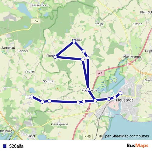The first stop of the 526alfa bus route is Roge, Feuerwehr, Mast 1l and the last stop is Bujendorf, Alte Schule, Mast 4o. 526alfa is operational during everyday.