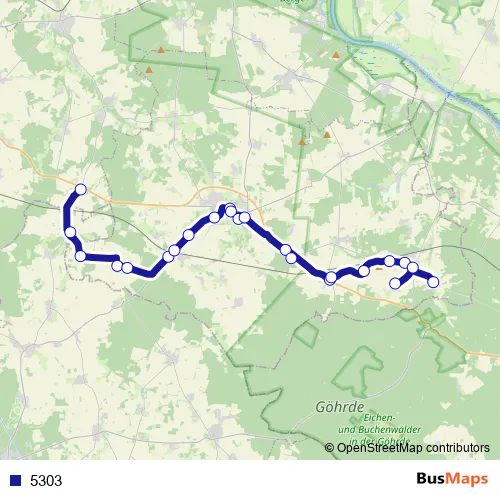 The first stop of the 5303 bus route is Bavendorf, Im Dorfe and the last stop is Nahrendorf, Nieperfitz. 5303 is operational during on weekdays.
