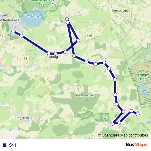 The first stop of the 541 bus route is Bad Bederkesa Schulzentrum and the last stop is Großenhain(Lintig) Wendeplatz. 541 is operational during everyday.