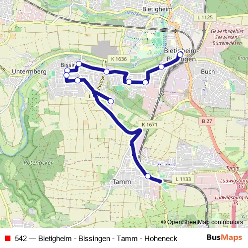 The first stop of the 542 bus route is Bietigheim Zob and the last stop is Tamm Bf. 542 (Bietigheim - Bissingen - Tamm - Hoheneck) is operational during everyday.