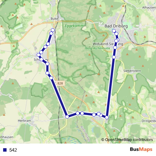 The first stop of the 542 bus route is Bad Driburg, Kapellenstraße and the last stop is Ab-Buke, Alter Postweg. 542 is operational during on weekdays.